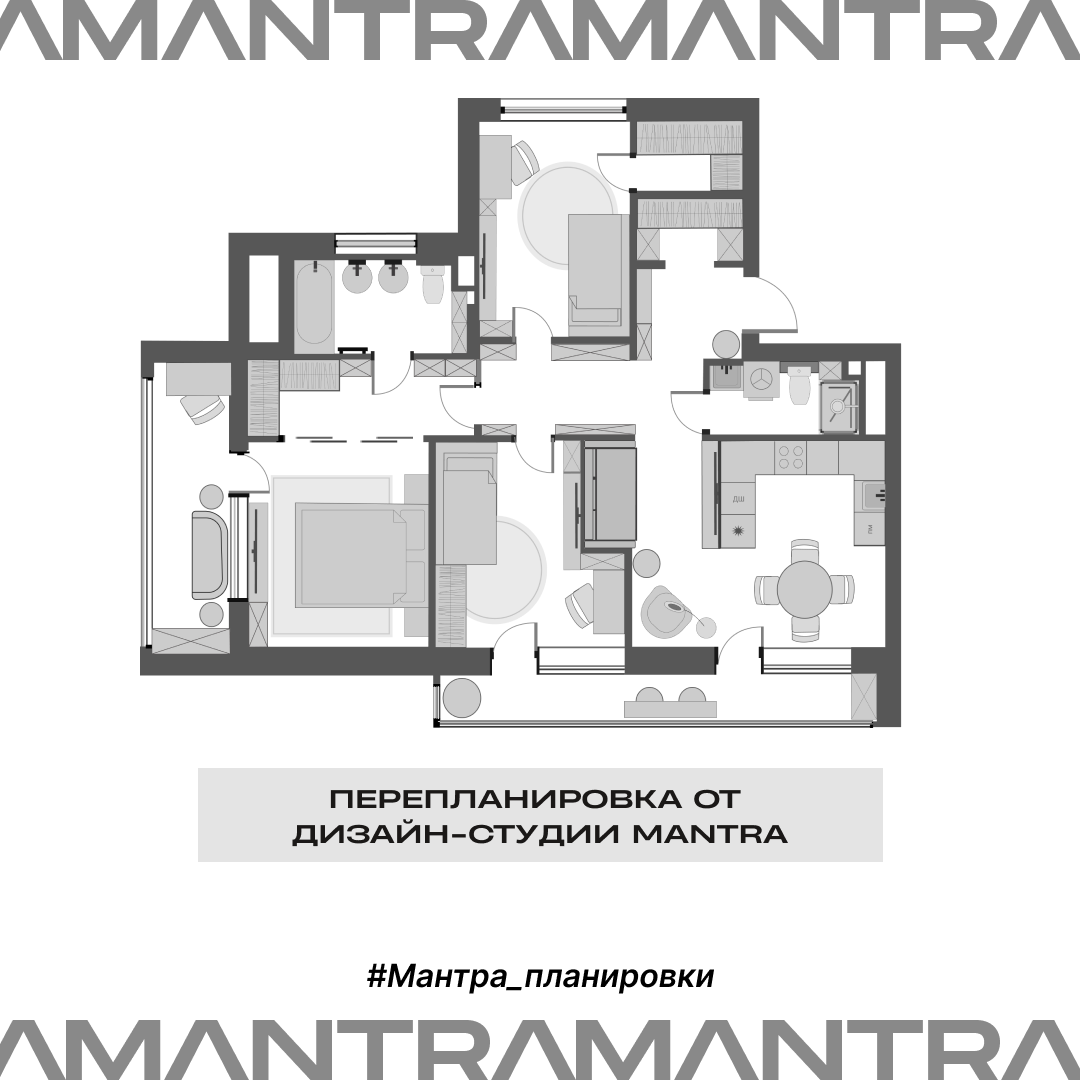 Мы выполнили чёткое зонирование на приватную и общую зоны. Новая планировка делит квартиру на две логические части: общая зона — кухня-гостиная, приватные пространства — хозяйская спальня, детские комнаты и гардеробные.